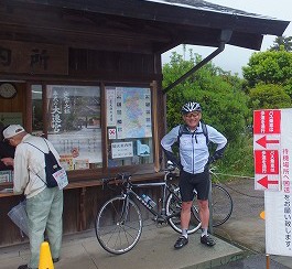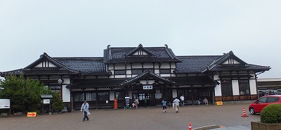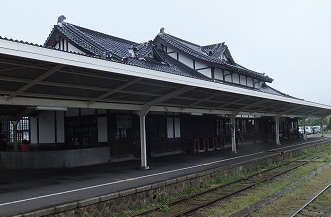 雨の中、2人での再スタートです。出発してすぐに旧国鉄の大社駅を発見。ちょこっと見学していきました。