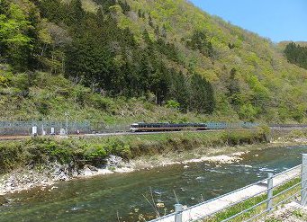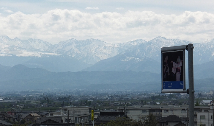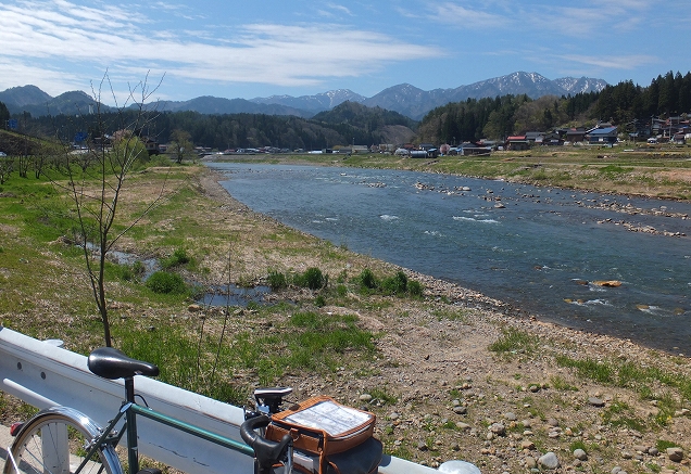 川と残雪の山に囲まれた風景を楽しむ!