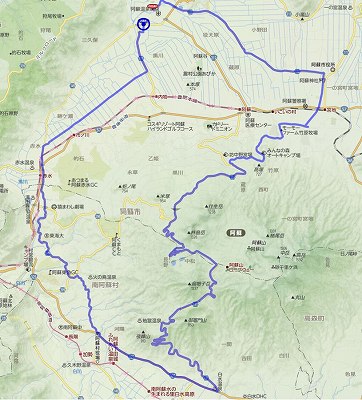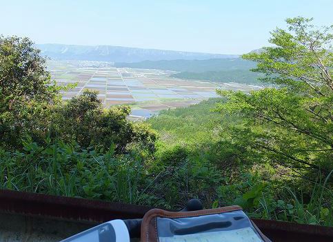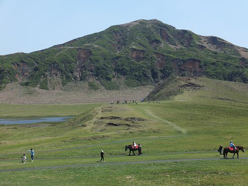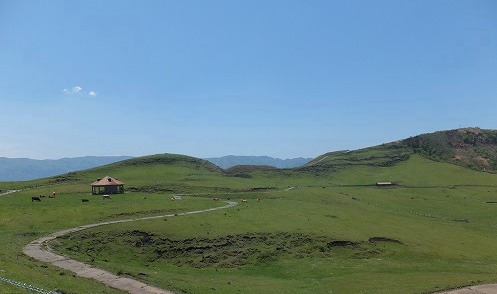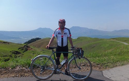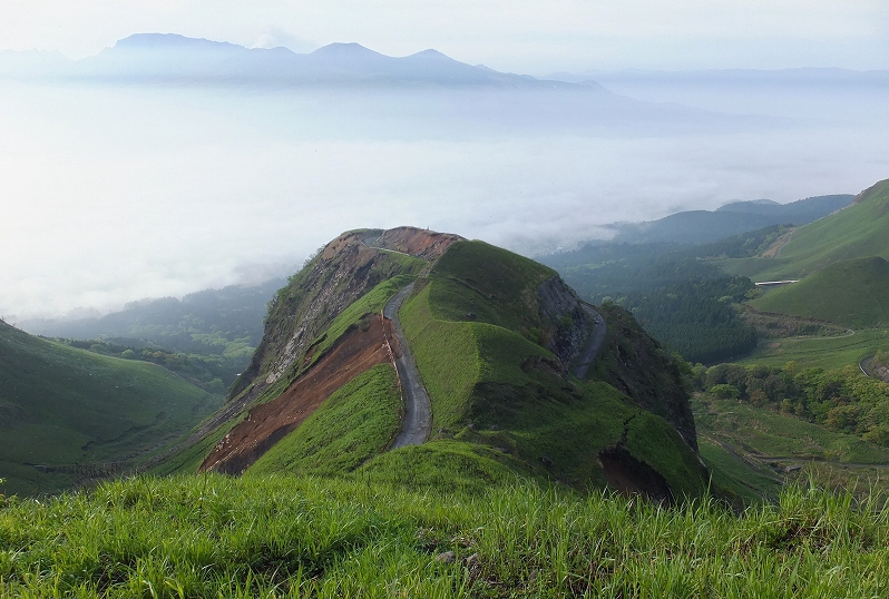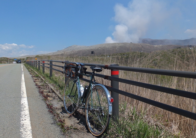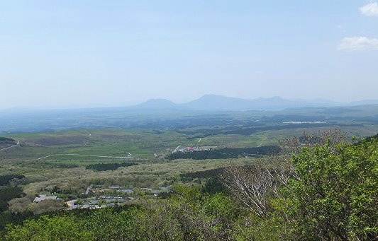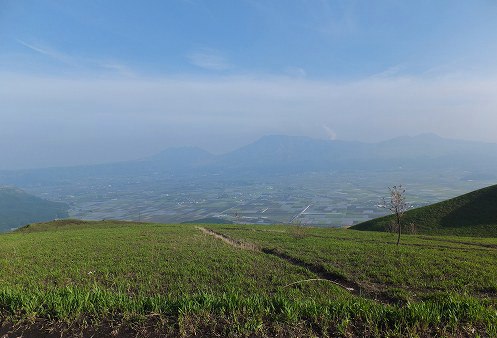 (阿蘇外輪山に一部 小嵐山 からの風景 噴煙をあげる阿蘇山を望む)