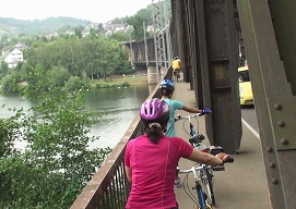 (アルフから対岸のブライに渡る鉄道・車道の二重橋:自転車は通りにくい歩道を行く)