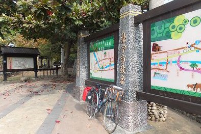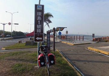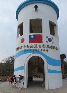 (宿屋を出発) (この看板が台湾一周サイクリングロードを示します)