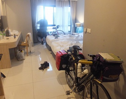 (自転車は部屋に入れてOKでした。エレベーターで移動します。) (出発準備OK 気温はすでに25℃)