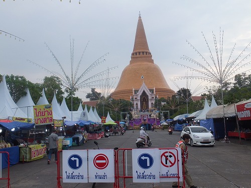 あるプラ・パトム・チェディに向かいます。ここの寺院には世界一高い仏塔があります。早朝からですが、多くの参拝者がお参りを