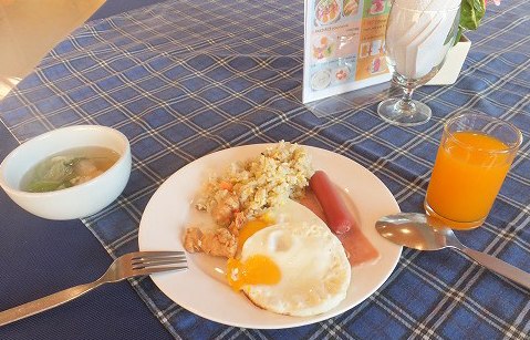 先に自転車の装備を完了して朝食をいただきます。本日の午前中でタイを出国するので、朝食がタイ最後の食事になります。
