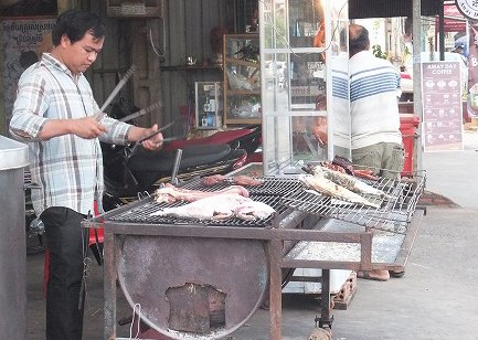 (シソポンの街並み) (幹線道路から一歩入ったところ、魚の丸焼き おいしそう)