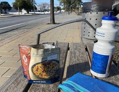 店屋はどこも開店していませんでした。仕方がないので街を出てすぐの遊歩道にあったベンチで小休止しました。
