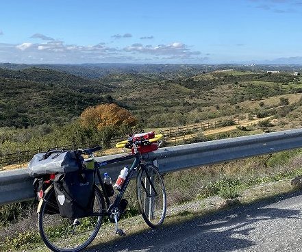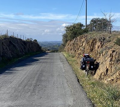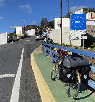 (ポルトガル入国後にいきなりの急坂 今の下りいらねー) (ポルトガルに入国 さあ!登るか!)