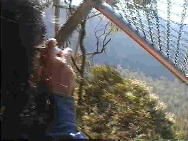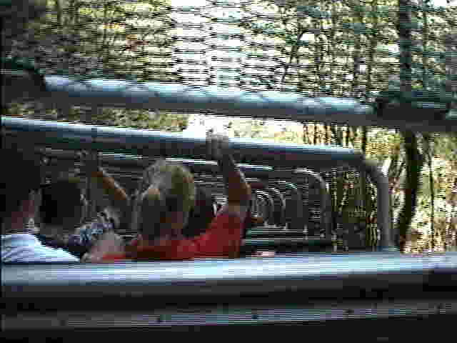 (絶叫!!トロッコ 足元の撮影です) (急斜度を落ちていくトロッコで奥方殿はおおはしゃぎ)