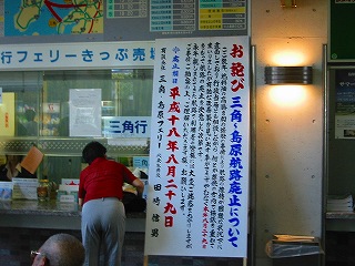 久しぶりの航路でよろこんで切符売り場に行くと「航路廃止のお知らせ」が・・・。残念ですが、思い
