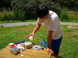 おこげができたがおいしく炊き上がる。昼食はふりかけご飯に味噌汁。