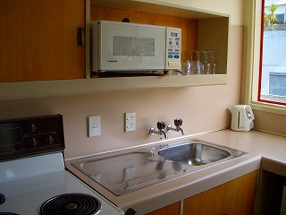 (本日のお宿:2階の角部屋にお世話になりました)(キッチンには食器・鍋等の調理器具が全てそろってます)