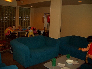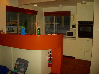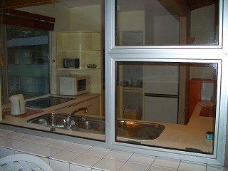 (今晩お宿は電話屋奥の建物の2階) (テラスからキッチンを見る)