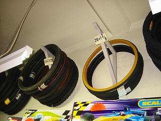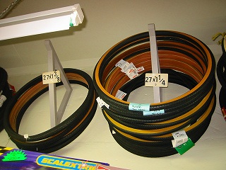 先ほどの店のようにプラモデルと自転車の両方をやっていた。天井にはサイズ別に修理用のタイ