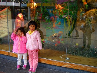 (子供達が気に入った、昔話をからくりで行っていたショーウンドーにて)