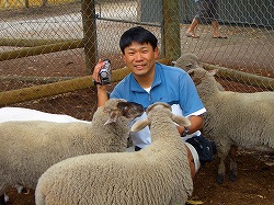 (カンガルーとのふれあい) (羊の怒涛の寄りにたじろぐ親父)
