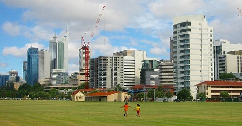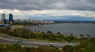 (パース スワン川沿いにあるだだっ広い公園からオフィス街を望む)