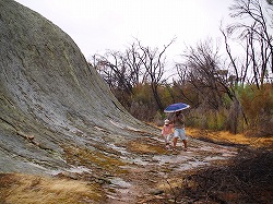 早速雨降りの中、購入した傘をさして見学へ。小道を進むとウェーブロックにご対面。