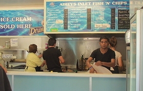 かくお腹がすいている、出来上がりまえ20分ほど待ってフィッシュ&チップスで昼食とする。
