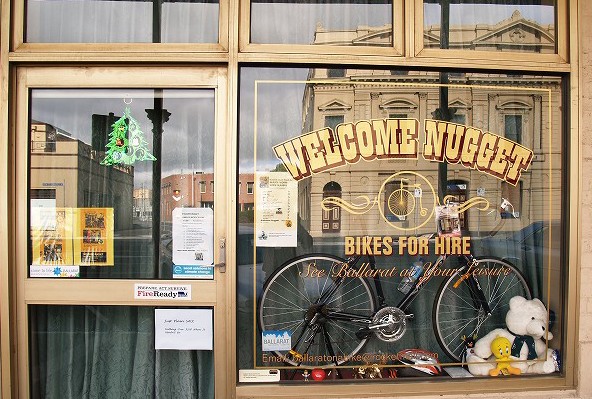 (バララット旧市街地にあった自転車屋 ガラスに映りこんでいるゴールドラッシュ時代の建物)