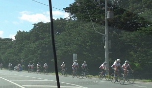 自転車の集団に遭遇。皆、腰にゼッケンをつけていることから、どうやらサイクリング大会の