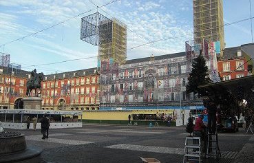 太陽の門からマヨール広場に移動します。広場はクリスマスマーケットの出店の準備中、出店中の店の商品を覗いて