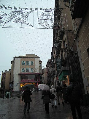 (雨の旧市街を通りアルカサル(城)に向かいます) (地元名物「子豚の丸焼き」の宣伝用キャラクター?)