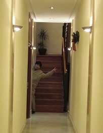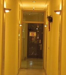 (宿屋の玄関通路) (右:午前7時過ぎでも冬のスペインはまだ暗い)