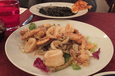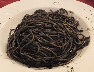 いるレストランに入ります。ここではイカ墨のパスタが有名なのでいただきました。見た目とは違い美味しくいた