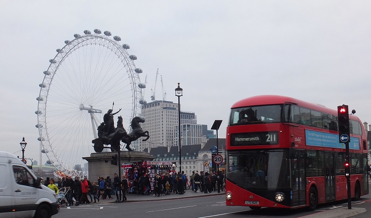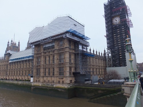 公園をぬけてウェストミンスター寺院を見て、テムズ川に出て国会議事堂・時計台(ビックベン)、観覧車(ロンドン・アイ)を見ながら冬のロンドンを散策