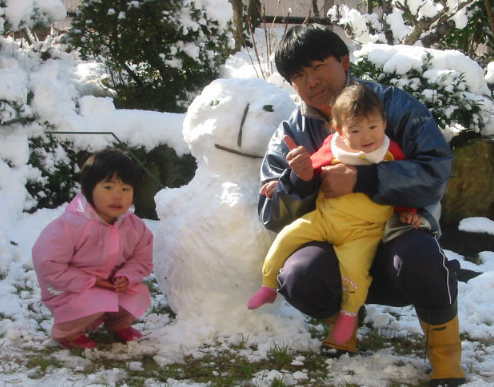 今朝起きたら庭が真っ白、周りの山など一面の銀世界。早速娘と一緒に雪だるまを