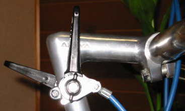 これまたサンプレのハンドルステム用Wレバー。変速機アウターの処理は、リヤ