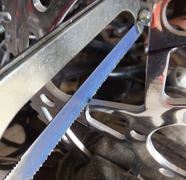 (49Dで使う5ピンのチェーンリング中央部を金ノコでぶった切ります)