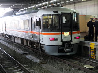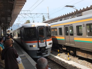 豊橋駅には、急行秘境号がホームに入っていた。「1番ホームに秘境号が入っていますが、間違えて乗らないように…」と添乗さん。 行きは、天竜峡まで特急伊那路利用なのです。 |