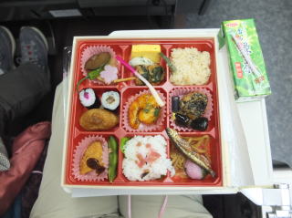 列車が発車してまもなく、特製秘境駅弁当が配られた。 パッケージに秘境号の写真と秘境駅6駅のイラストが入れてあり、バックは平岡ダムでまとめてある。 山菜の天ぷらなども入っていて、いなり寿司やかやくご飯なども詰めてあり、けっこうボリュームのある弁当だった。 |
