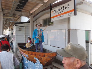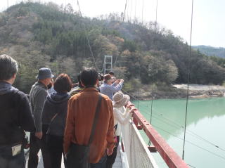 吊り橋まで行き、橋の4分の3くらい渡ったところからは、天竜川を渡る飯田線の橋がほんの少し見えた。長野県内で天竜川を渡る唯一の橋梁とのこと。 天竜峡駅に、上り急行「秘境号」が入ってきた。いよいよ、秘境駅ツアーの始まりです。 |