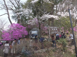 ガイドさんが説明をしてくれて、いくつもある石碑の説明を聞くに付け、皇太子(現在の天皇)をはじめ、多くの人に訪ねられている名所のようだ。 ミツバツツジと桜が満開で、ちょうどいいときに訪ねることができた。 |