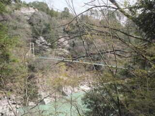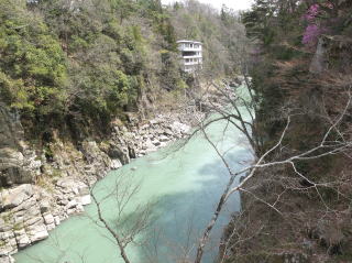 | ボリュームのある弁当を食べた後、小1時間の天竜峡散策。水の色が浅黄色とでもいうのか、妙に落ち着いた感じの色だった。 川下りは健在のようで、船が下るのを見かけることもできた。 |