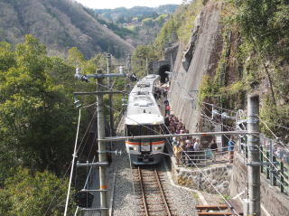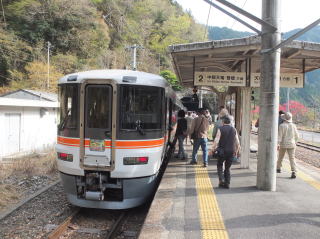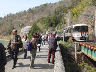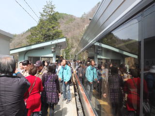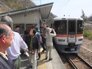 | 4月12日(土) 春の飯田線秘境駅ツアーに参加した。 名古屋駅から出発するグループに豊橋から合流する形だった。 多いときでも1時間に1本。下手をすれば2時間以上電車の止まらない駅に、 急行が停車し、見学時間まで確保されるのだ。 当日配られた「秘境6駅&みどころマップ」で紹介された秘境駅ランキングは、 平成25年12月現在の牛山氏HPに掲載されたものとのこと。 |