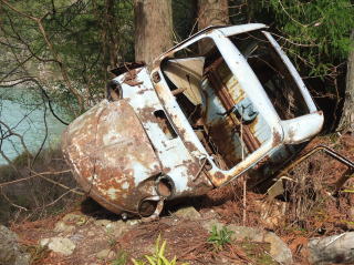 ここにはりっぱな駅舎もある。近くの広場で行われた結婚式の写真も飾られている。 駅舎を出て坂道を下ると、愛のベンチがあったり、廃屋がある。さらに川に近づくと、懐かしいダイハツミゼットが朽ちて残っていた。 ちなみに、ここの秘境駅ランキングは2位。 |