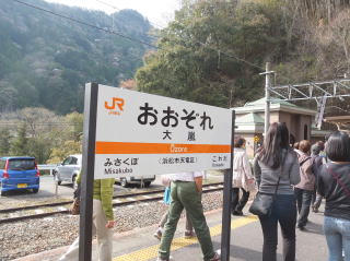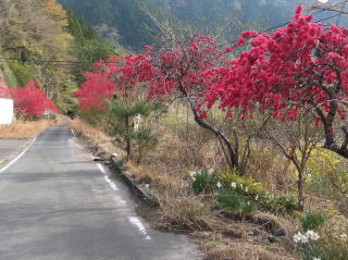 駅の横の道路沿いに植えられた赤の目立つ木々が目を惹いた。 大嵐駅も、トンネルとトンネルの間の駅で、右側の列車の後方にトンネルが見える。 |
