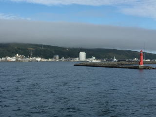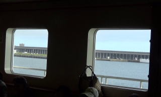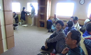 7時15分稚内発礼文島行きのフェリーは、混んでいた。椅子席は少ないので、絨毯積へと勧められた。長崎から五島列島へ向かう時の高速艇を思い出す。こちらはずいぶん広かった。 船が港を出るときには、稚内港北防波堤ドームが見えた。 |