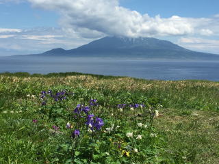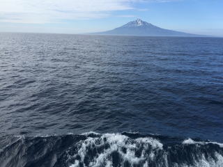 稚内港を出て、初めての北海道の離島に向かう。2時間弱の船旅だ。 礼文島に向かう船から、利尻山がくっきり見えた。ますで、富士山が海に浮かんでいるようだ。 |