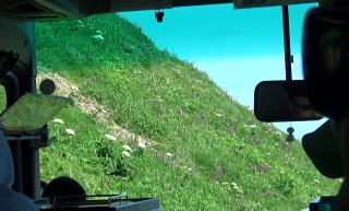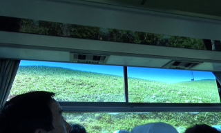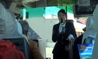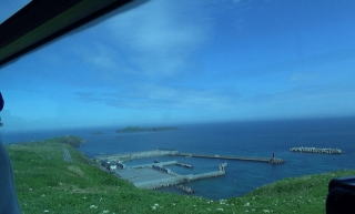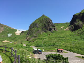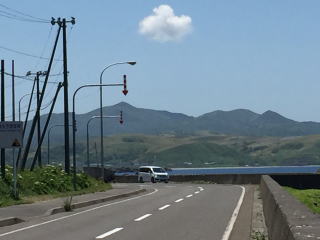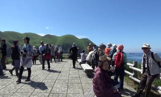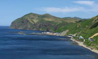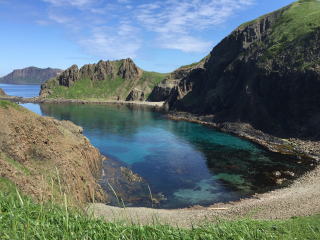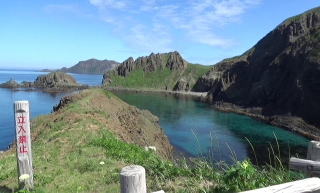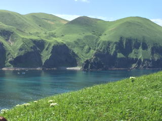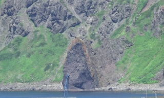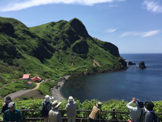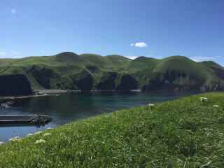 入り江の向かい側のこぶ山の景色は見飽きなかった。水の色もとても美しい。 バスに乗って、レブンアツモリソウ群生地に向かう予定があったのだが、花はすでに終わっていて、その横を通過し、スコトン岬へ向かった。 途中でガイドさんは、島内に2つだけあるという信号機の一つを紹介しようと、一瞬腰を落とした。 「見えました?青でしたね」 |