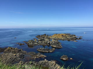 | 岬には連なる岩礁の先には、日本海の水平線が広がっていた。 その左側には、入り江があって漁港になっていた。海に出っ張ったこぶ山の緑色が、何とも新鮮だった。 |