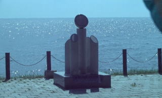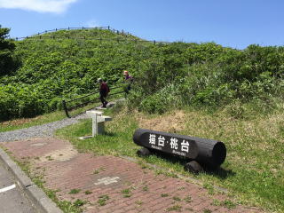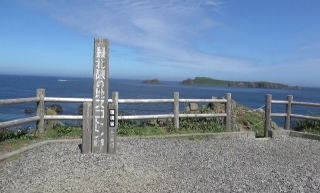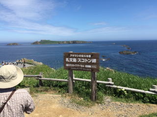 | 最北限の地スコトン岬の標柱があり、沖には、通称トド島という無人島が見えた。 かつては、トドもいたようだ。 その先に、運が良ければサハリンも見えるようだが、こんなに晴れていても、そこまでは見えなかった。 |
