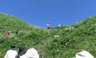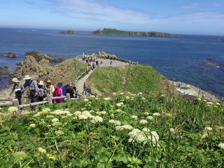 | 礼文観光のスタートは、澄海岬から。 駐車場でバスを降りて、目の前の山や丘の肌のさわやかな緑色に心癒された。 ガイドさんは、道端の草花について紹介してくれた。一つ一つの花に、ちゃんとした名前があるんだ。 少し先に、丘を登る小道があった。その小見戸の両側には、白や黄色の花が咲き乱れていた。(花の名前は、花ハイキングのページで) |