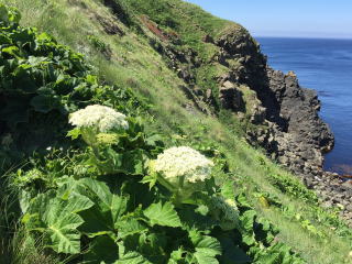 スコトン岬の眺めは、見飽きないものだった。しかし、風は肌に冷たく、長くいることもつらかった。 岩肌と海の色、そこに咲く花。 寒さが身に染みる。最北限の土産物屋へ急ごう。 |