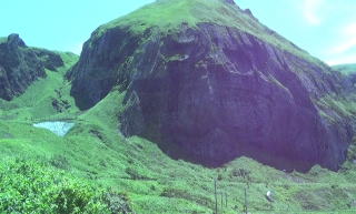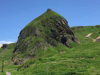 猫台・桃台は、猫岩、桃岩を眺めるための展望台。少し上るだけだが、眺めがいい。桃岩も、猫岩も、そして、遠くに地蔵岩も見える。 その中でも、やはり、桃岩のインパクトが大きい。見る方角によって形が変わるのが面白い。 |