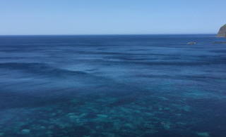 木の手すりが続く道を上って中腹に着くと。目の前に澄み切った入り江が見えた。 この景色をじっくり味わいたいと思ったし、写真もたんまり撮りたいと思ったが、ガイドさんに先を急ぐようにせかされた。 |