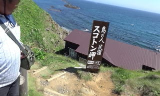 先端に続く道を進むと、「石を投げないでください」という看板があった。その先のがけ下に、島の最北端の民宿があった。なるほど。 そこから坂道を下ると、スコトン岬の表示札が。 そこから、さらに下っていくと、まさに最北端。 |